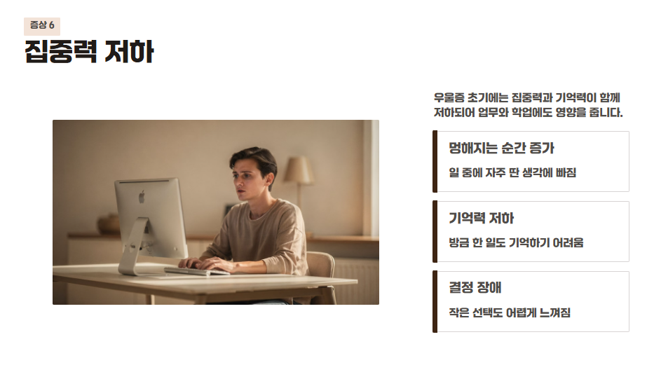 우울증 초기에는 집중력이 떨어지는 증상이 나타날 수 있습니다.