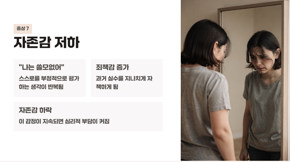 우울증 초기에는 자신에 대한 부정적인 생각이 늘어날 수 있습니다.