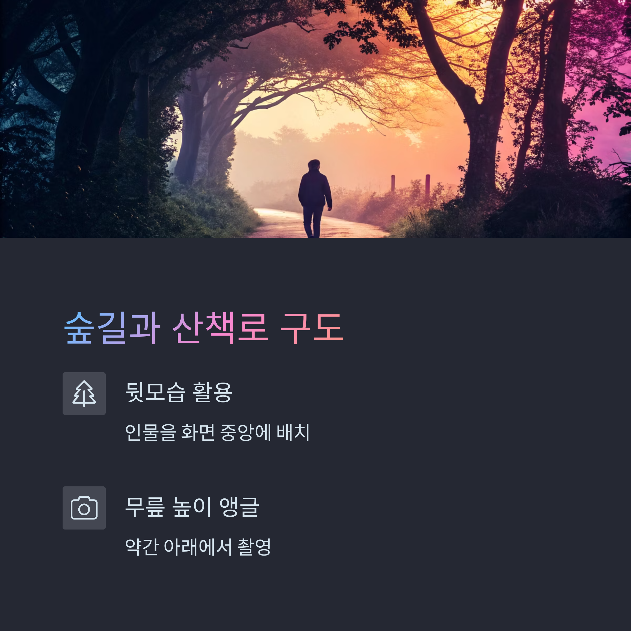 피사체(사람)를 화면 중앙에 배치하고 뒷모습을 활용하세요.