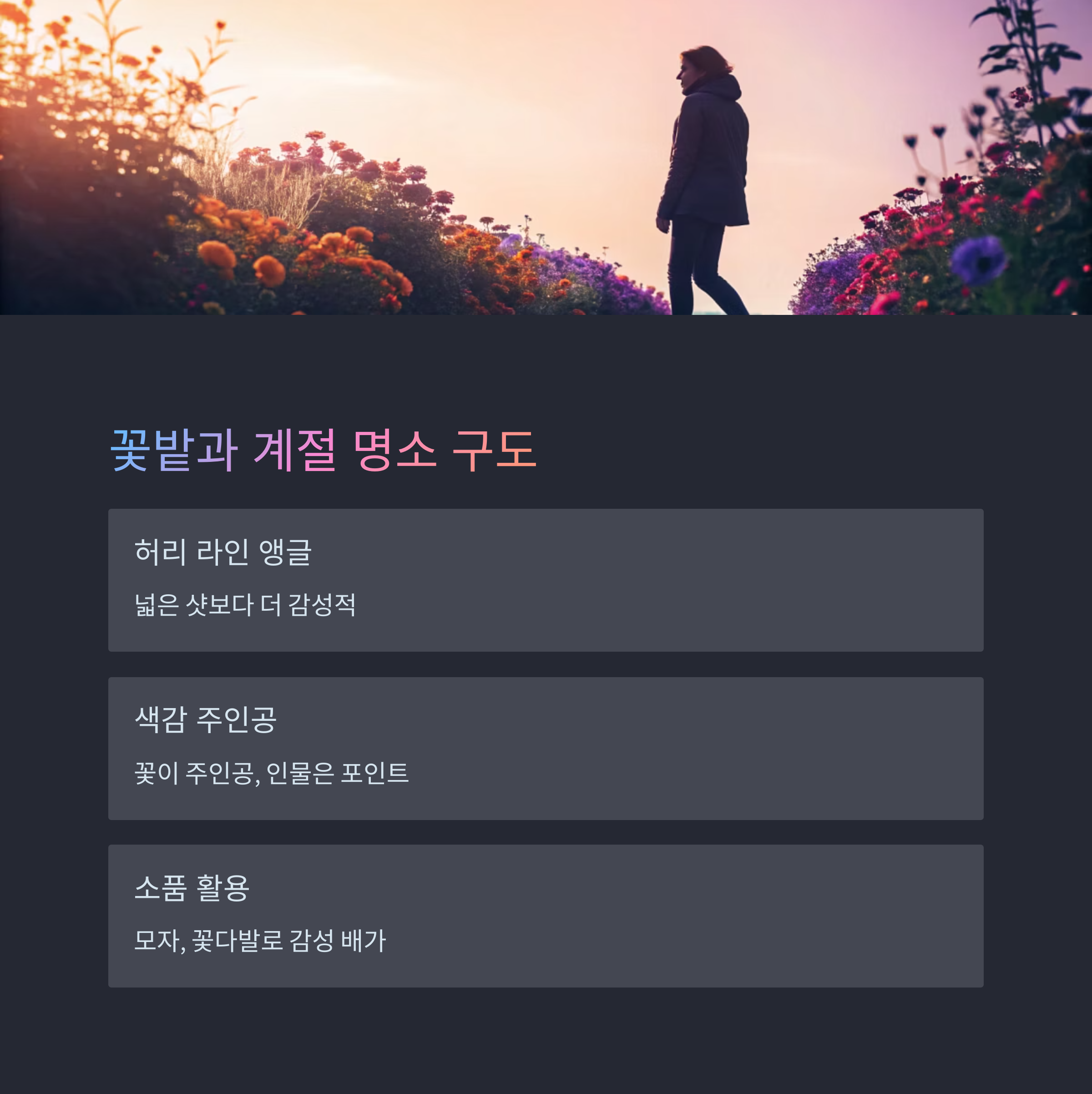 7. 꽃밭/계절 명소 – 허리 라인 앵글로 색감 중심 구성